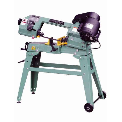 The General International model 90-660 M1 horizontal band saw is ideal for maintenance shops and contractors as well as metal and plastic fabricators. Cut all types of metals: ferrous and non ferrous, steel pipe, angle iron, conduit, brass, aluminum, and copper with the model 90-660 M1 5 In. x 6 In. horizontal metal cutting band saw. The ball bearing motor with efficient worm gear, oil bath drive system, offers 3 speed options for cutting varying weight and shaped materials. Perform horizontal on vertical cutting with the convenient auxiliary table (standard equipment). The 90-660 M1 also includes an automatic shut-off, a heavy-duty steel stand, and 2 sturdy wheels for ease of mobility.